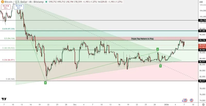 从技术面来看,比特币正处于十字路口。若确认突破并收于94,500美元以上,将消除三重顶部风险,并开启通往97,300美元的路径,随后是100,700美元的长期结构交汇点。