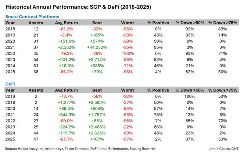 根据Real Vision首席加密分析师Jamie Coutts分享的区块链数据,除比特币(BTC)外,2025年更广泛的加密货币市场呈现看跌趋势。去中心化金融(DeFi)代币平均下跌67%,与智能合约区块链相关的加密货币回报为-66%。