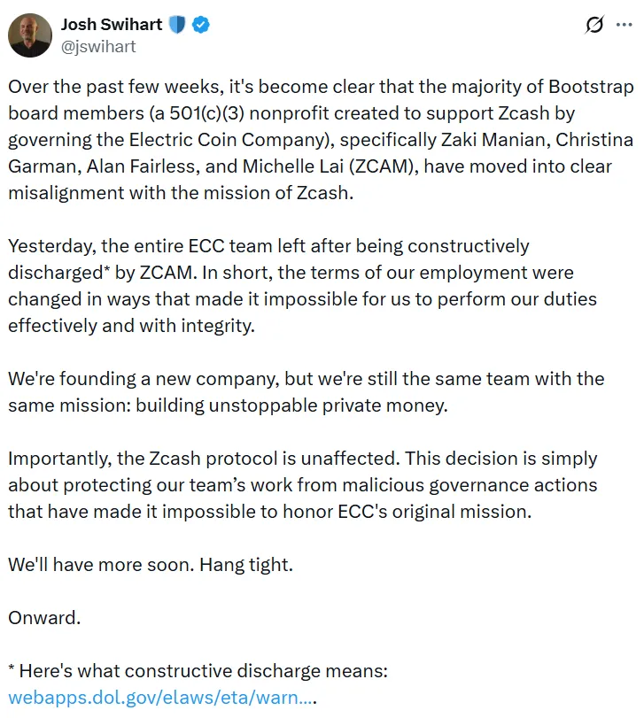 根据Swihart的说法,Zcash背后的Electric Coin Company(ECC)团队已与支持该代币的非营利组织Bootstrap分离。他指出,Bootstrap董事会的多数成员与Zcash的使命出现明显不一致。