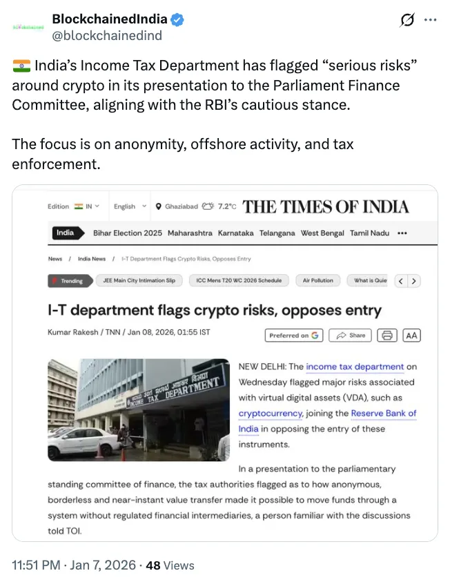 印度税务部门指出,离岸交易所、私人钱包及去中心化金融工具的风险,可能使得追踪加密货币收入变得“几乎不可能”。