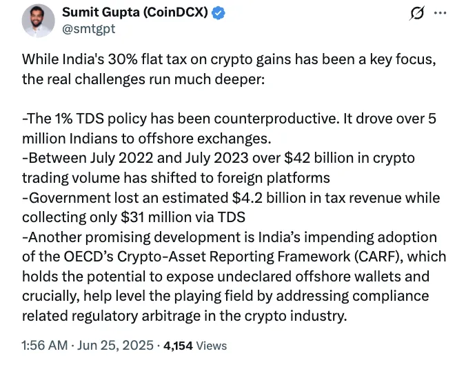 然而,现行的税制带来了挑战。CoinSwitch联合创始人Ashish Singhal表示,加密交易产生的损失无法抵扣,导致了“摩擦而非公平”。