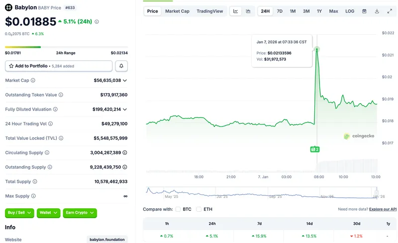 根据CoinGecko的数据,BABY在周三的价格大幅上涨,截至发稿时上涨约5%。
