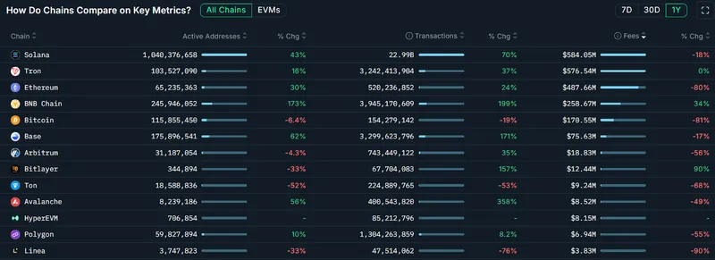 回顾过去一年,Solana以5.85亿美元的手续费收入成为领先区块链,紧随其后的是Tron,收入达5.76亿美元,据加密情报平台Nansen数据显示。