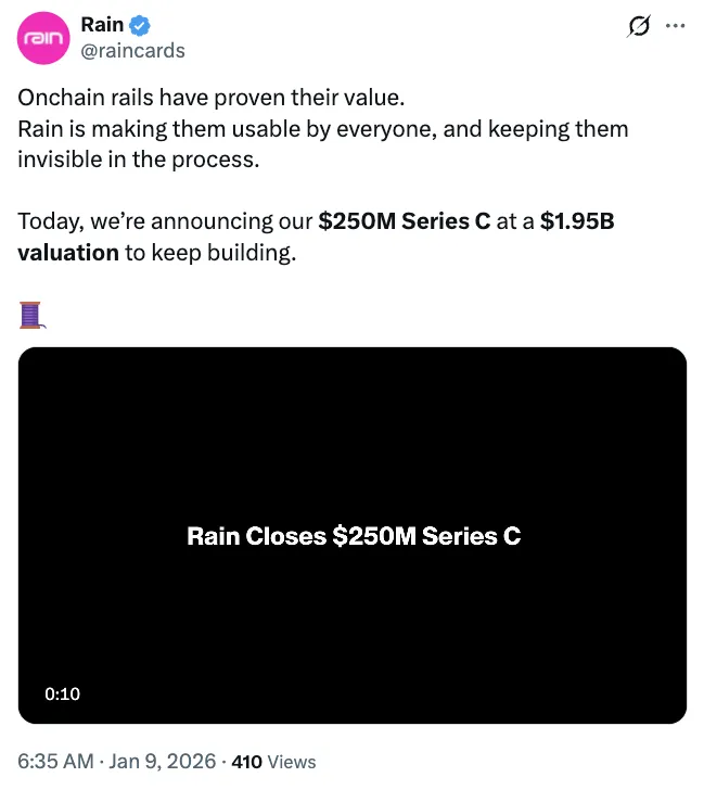此次融资使Rain的估值达到19.5亿美元,公司的总融资额增至3.38亿美元,此前在2025年8月完成了5800万美元的B轮融资,并在去年3月筹集了2450万美元。