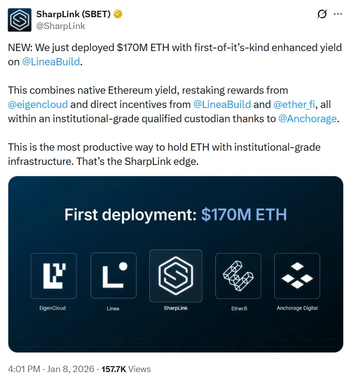 SharpLink于周四宣布,已将额外的1.7亿美元以太币部署到以太坊二层扩容解决方案Linea,以获取更多的质押奖励。