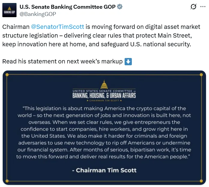 与此同时,参议院银行委员会已发布通知,计划于本周四东部时间1月15日上午10点召开CLARITY法案修订会。