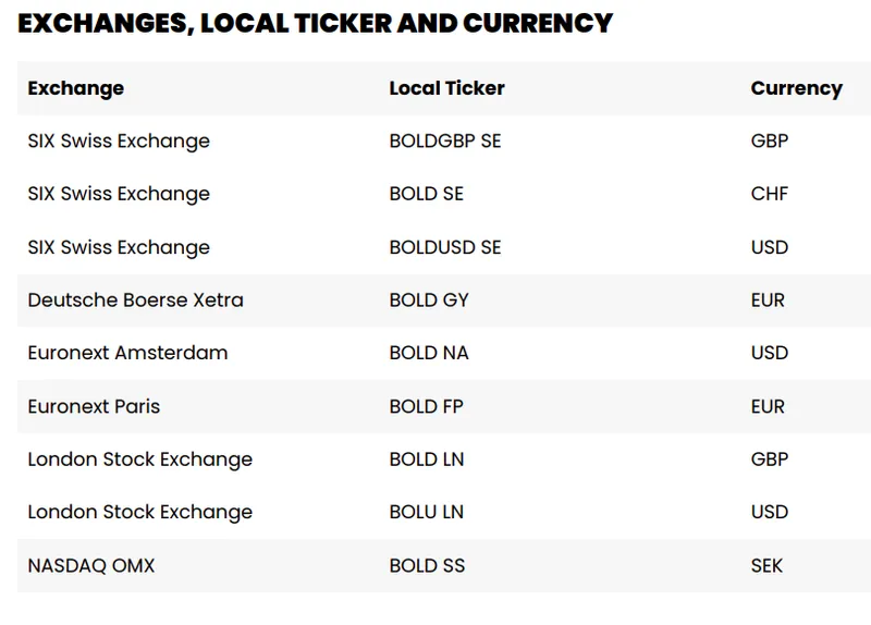 此次在伦敦证券交易所的推出是继21Shares于2022年4月在瑞士证券交易所(SIX Swiss Exchange)首次推出BOLD之后的重要扩展。该公司已成功将该产品上市至多个欧洲主要交易所,包括德国证券交易所Xetra、阿姆斯特丹泛欧交易所、巴黎泛欧交易所和斯德哥尔摩纳斯达克。