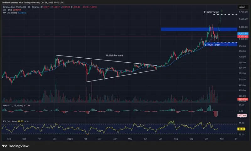 本月早些时候,BNB突破了一个看涨旗形形态,达到1369.99美元的历史高点,随后回落约19%。目前其相对强弱指数(RSI)约为50,表明该代币正在巩固。