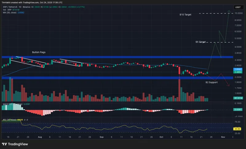 Claude AI的数据模型显示,Ripple的本土资产XRP($XRP)可能会迎来一波强劲反弹,有望在年底前攀升至5至10美元之间,四倍于目前约2.49美元的价格。