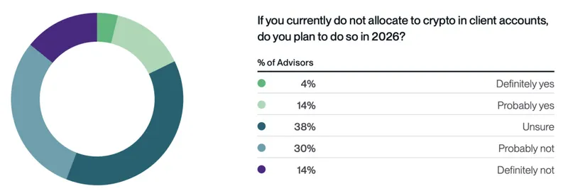 展望未来,下一波增长可能来自那些尚未参与加密货币投资的顾问。在未在客户账户中配置加密货币的顾问中,有18%表示他们可能在2026年增加配置,另有38%表示正在考虑此事。而已经配置的顾问中,99%计划维持或增加其投资。
