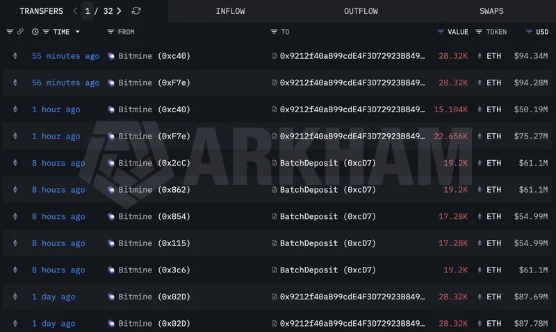 根据Lookonchain的报告,由Tom Lee领导的BitMine Immersion Technologies(BMNR)向“Beacon Depositor”地址新增了186,560枚以太坊,价值约6.25亿美元。
