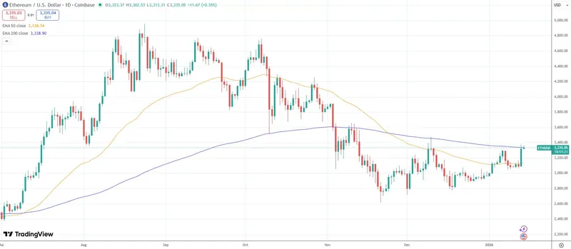 根据TradingView的数据,该资产在周三早盘于Coinbase触及3375美元,创下自12月10日以来的最高水平。
