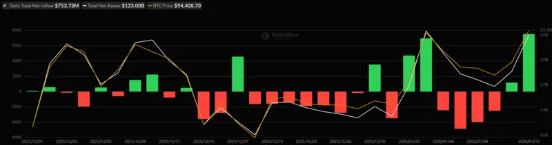 周二,美国比特币现货交易所交易基金(ETF)连续第二天录得正流入,总计增加$753.73百万,为自十月以来的最高水平。至此,总净流入增加至$57.27十亿。