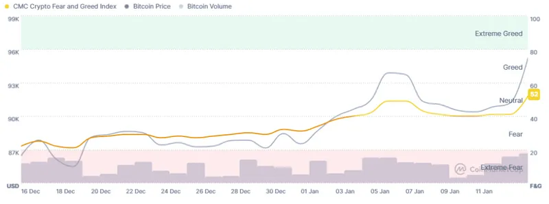 今天,加密恐惧与贪婪指数为52,较过去几天的41有所上升。
