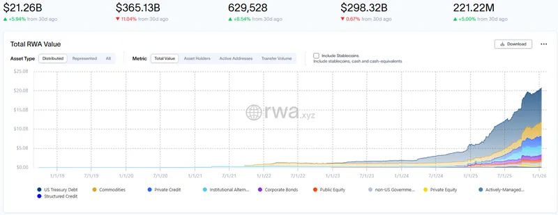根据RWA.xyz的数据,截至周四,估计已有超过210亿美元的现实资产上线区块链,持有者超过62.9528人。