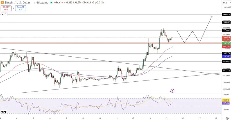 当前区间类似于一个看涨的整合旗帜,暗示积累而非分配。若短暂回调至支撑位后形成更高低点,可能为再次突破97,600美元奠定基础。一旦确认突破,将暴露98,800美元的目标,并有可能延伸至心理关口100,000美元。