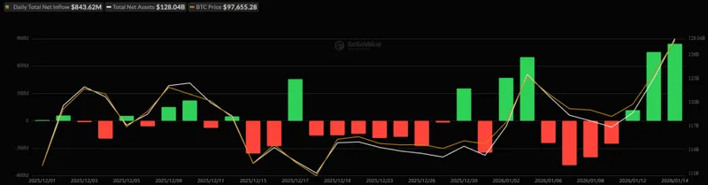 周三,美国比特币现货交易所交易基金(ETF)连续第三天录得正流入,总计增加8.4362亿美元,为10月初以来的最高水平。这是ETF连续第二天达到10月的水平,净流入总额已达到581.2亿美元。