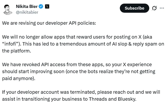 人工智能驱动的加密平台如Kaito.ai和Cookie DAO被禁止在X上通过支付用户以发布内容的方式,旨在遏制平台上的“AI垃圾”内容。Nikita Bier在1月15日的声明中指出:“我们将不再允许通过X奖励用户发布内容的应用,这导致了大量的AI垃圾和回复垃圾信息。”