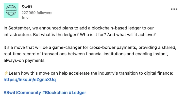 SWIFT已于2025年9月宣布计划在其基础设施中添加基于区块链的账本。SG-Forge是SWIFT账本项目全球合作伙伴之一,项目聚焦于实时、全天候的跨境支付系统,最初基于以太坊软件公司Consensys开发的概念原型。