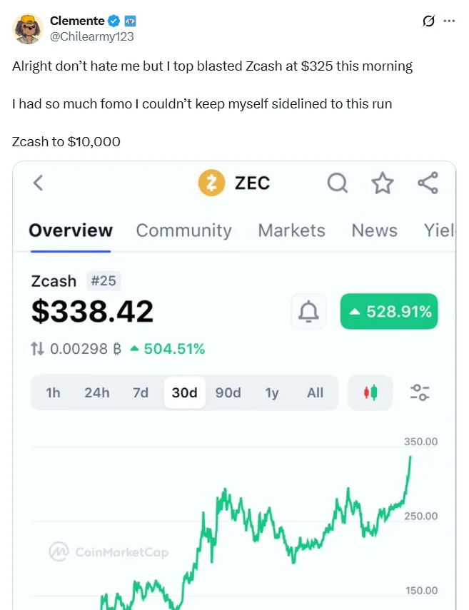 与此同时,加密货币交易员Clemente承认,他之所以参与Zcash交易,是因为“FOMO太严重,无法在这次上涨中保持观望”。
