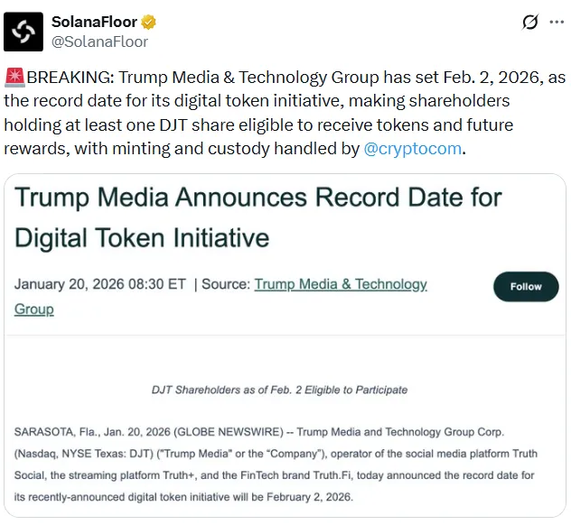 美国总统特朗普的媒体公司已推进其首个股东代币空投计划,确定2月2日为股权登记日。