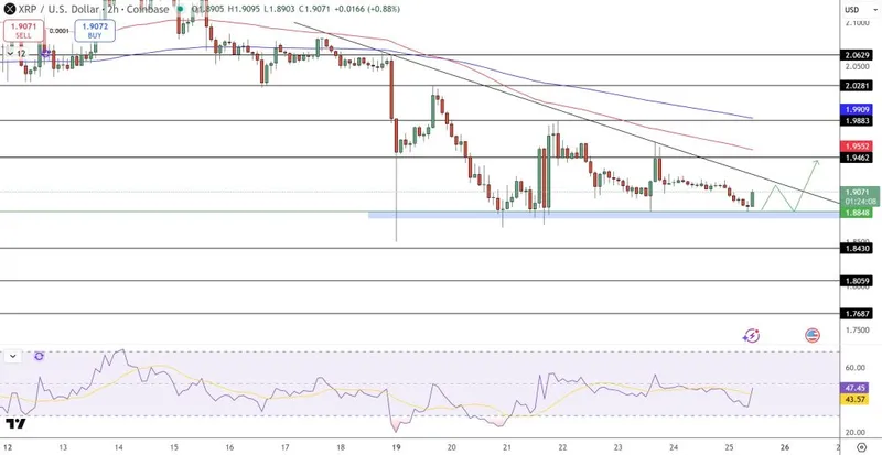 从技术角度看,XRP的短期价格预测保持谨慎中性。在2小时图表上,价格在一个下降通道内稳定,受限于接近$1.95的下降趋势线。XRP的交易价格低于50日和100日指数移动平均线,而200日指数移动平均线在$1.99附近持续构成强有力的阻力。