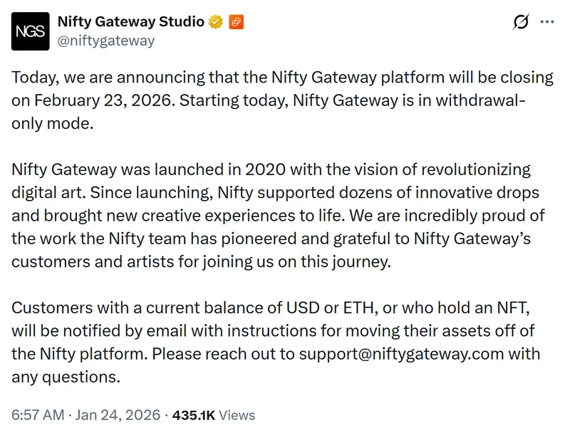 “今天,我们宣布Nifty Gateway平台将于2026年2月23日关闭,”该平台在周六通过X平台发布消息,并补充已进入仅限提现模式,为用户预留约一个月的时间以转出剩余NFT或资金。