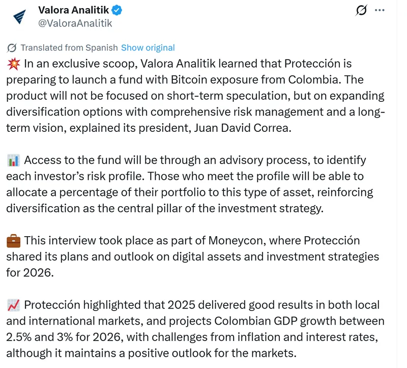 AFP Protección正在筹备推出一只可投资比特币的基金。该公司的总裁Juan David Correa在接受媒体采访时确认了这一计划。他表示,基金的准入将受到限制,投资者需通过个性化顾问流程来评估风险承受能力,只有符合条件的客户才能将部分资金配置到比特币(BTC)中。