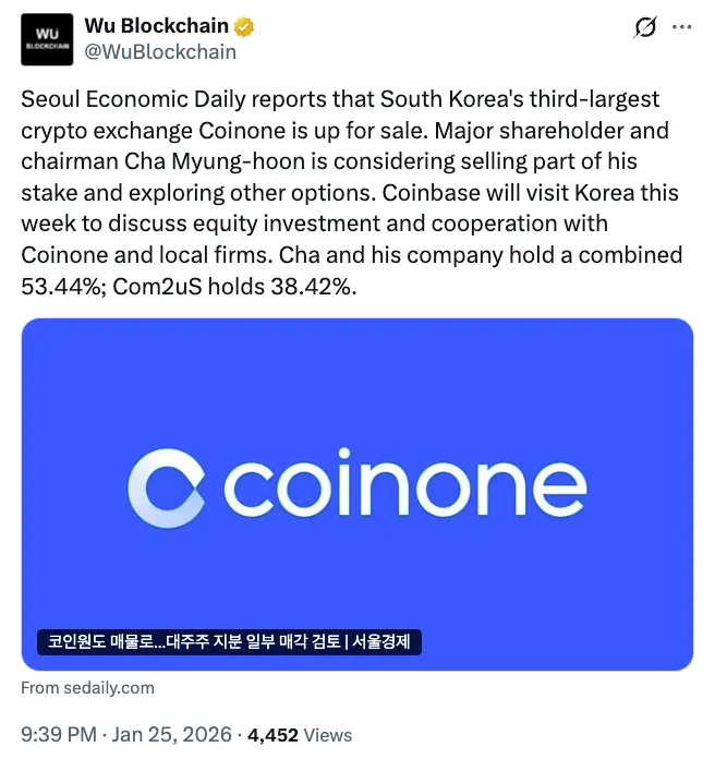 根据《首尔经济日报》的报道,Coinone已启动出售董事长Cha Myung-hoon所持股份的相关流程,Cha目前控制着公司53.4%的股权。