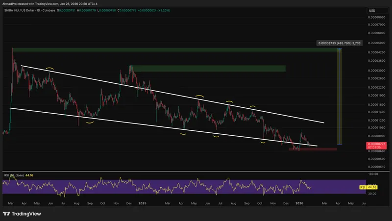 Shiba Inu的图表呈现出一个长期受到尊重的下降通道,价格持续出现更低的高点和低点。