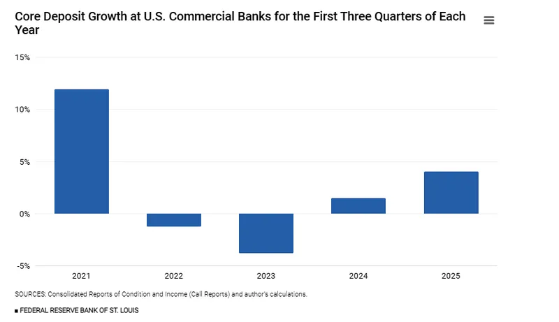 核心存款在2025年增长了约4%,高于前一年的1.5%,受到美联储降息和量化紧缩放缓的支持。