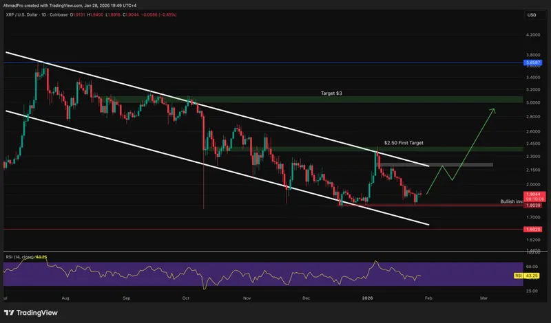 XRP仍处于一个控制价格的下降通道内,最近的反弹发生在1.80至1.85美元的需求区间。