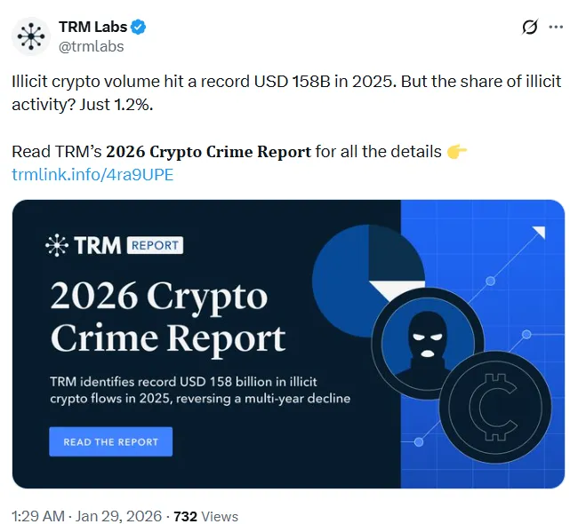 尽管非法资金规模上升,其在整体加密交易量中的占比却有所下降,从2024年的1.3%降至2025年的1.2%。