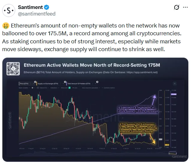 根据Santiment的分析,尽管以太坊价格保持稳定,过去六个月内加密交易所上的以太坊供应量却持续下降,持有者积极参与质押。