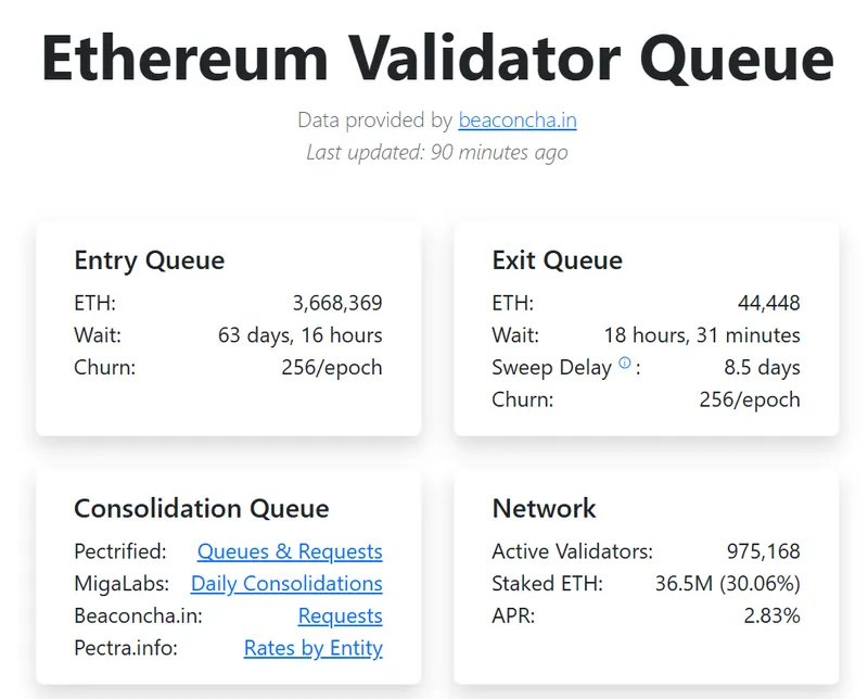 以太坊网络的验证者入队队列非常拥挤,目前有360万枚代币在等待质押,预计等待时间为63天。