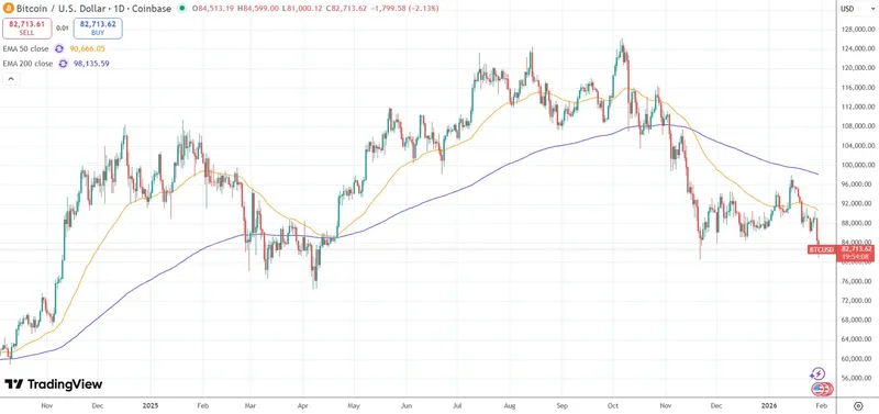 根据TradingView的数据,比特币在Coinbase最低跌至81,058美元,自四月以来创下新低。该币自去年十月的12.6万美元历史高点已下跌35%。