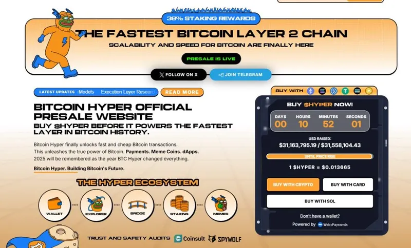 Bitcoin Hyper($HYPER)为BTC生态系统带来了新阶段。尽管BTC仍是安全性的黄金标准,Bitcoin Hyper则弥补了其速度不足的短板。其结果是:快速、低成本的智能合约、去中心化应用程序,甚至是模因币的创建,均由比特币保障。