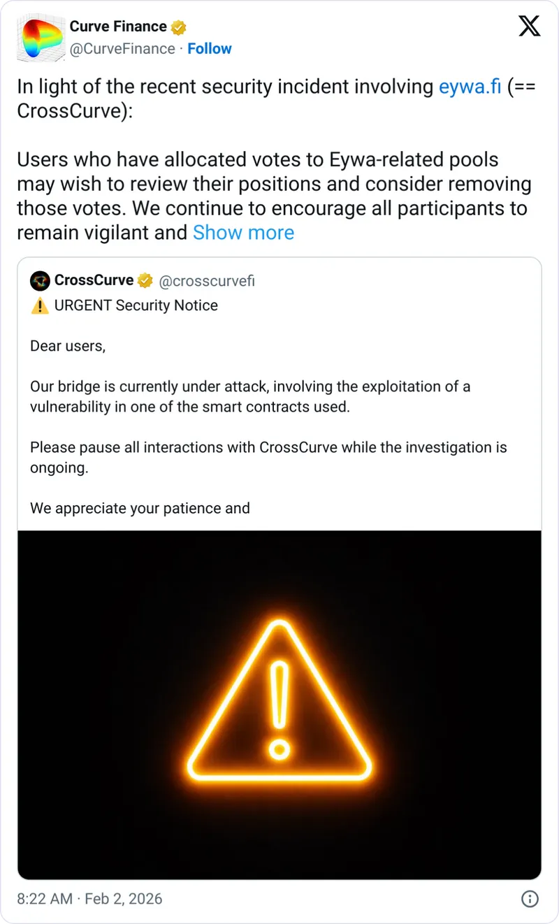 与CrossCurve合作的Curve Finance在社交媒体上表示,已向CrossCurve资金池分配资产的用户应考虑重新评估仓位并撤回相关投票。