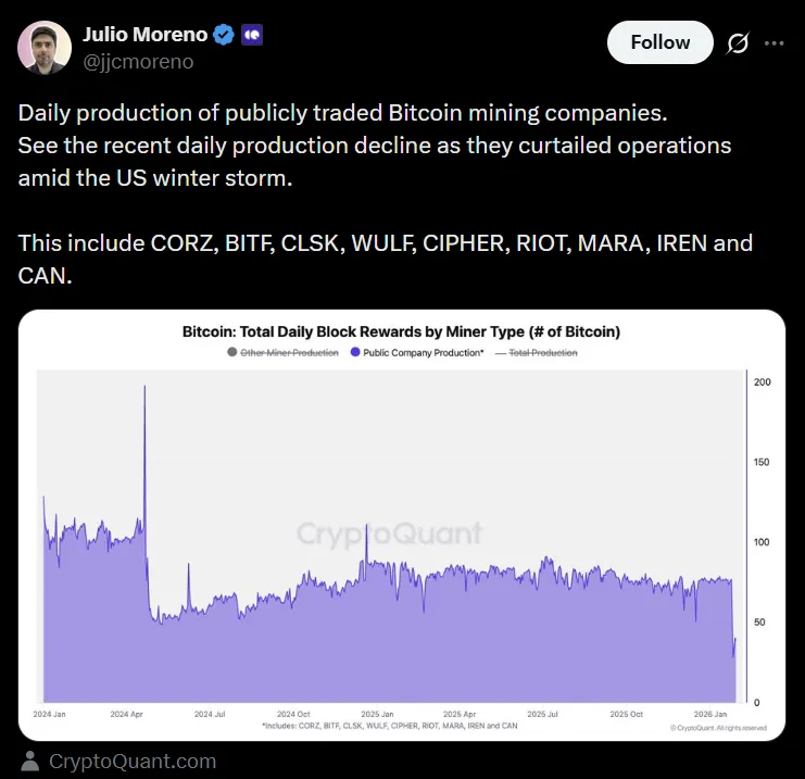 CryptoQuant研究主管Julio Moreno提供的数据表明,风暴前几周,被该机构追踪的上市矿企日均产量通常在70至90枚比特币之间,但在风暴高峰期骤降至每日约30至40枚。