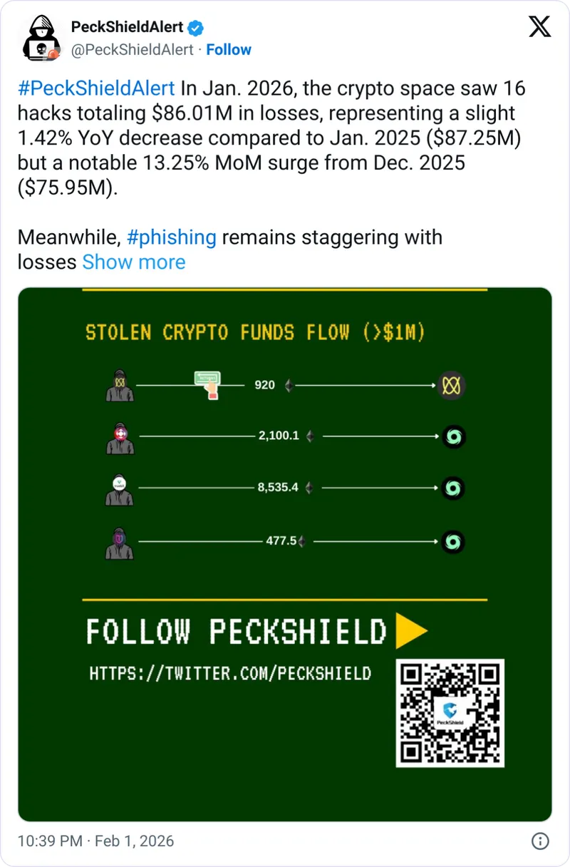 1月的损失额是自去年2月以来的最高水平,当时攻击者在一个月内窃取了约15亿美元,其中大部分来自加密货币交易所Bybit的黑客事件。