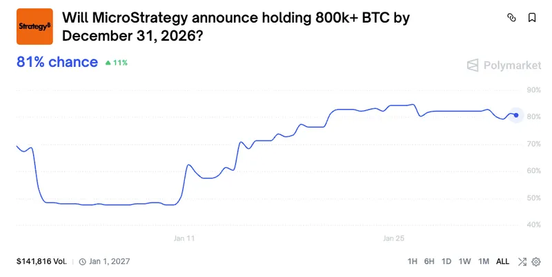与此同时,今年比特币跌破6.5万美元的概率已升至72%,但Polymarket同时显示,Strategy的比特币持仓到2026年将达到80万枚的概率为81%。