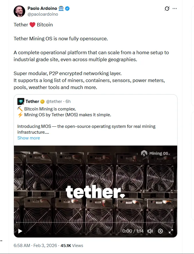 与此同时,Tether首席执行官Paolo Ardoino表示,MiningOS是“一套完整的运营平台,可从家庭设备无缝扩展至工业级站点,甚至支持多地协同部署。”