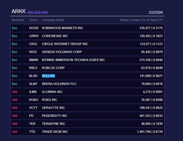 本周,方舟投资在多个创新和金融科技主题的ETF中增加了对Robinhood、Circle、BitMine、Bullish及其他与加密货币相关公司的投资敞口。