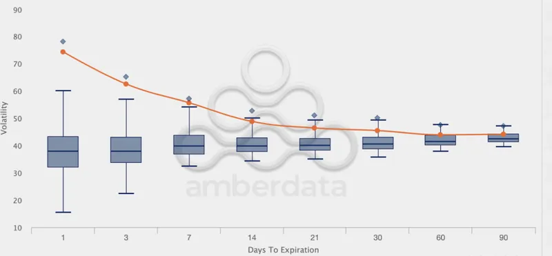 比特币波动性期限结构(橙色线)与历史数据的箱线图(蓝色)叠加。
