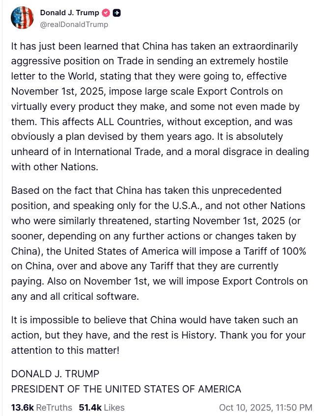 特朗普在10月10日的Truth Social帖子中提到:“从2025年11月1日开始(或更早,取决于中国的进一步行动),美国将对中国征收100%关税,这将在目前的关税基础上增加。”