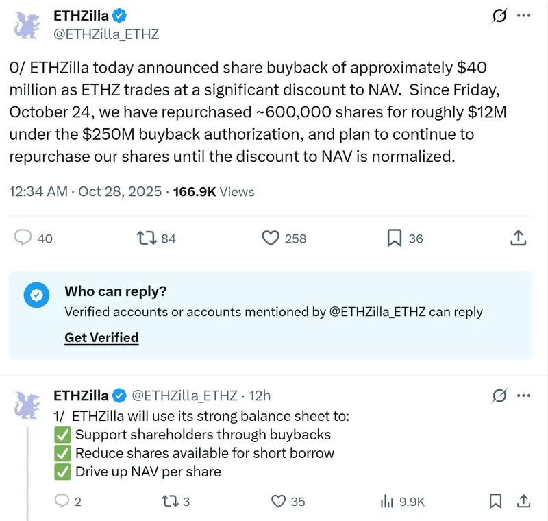 本周一,由于股价较净资产值大幅折让,另一家企业ETHZilla宣布实施4,000万美元的股票回购。公司表示,自10月24日以来,在2.5亿美元的回购计划下,已回购约60万股,总价值1,200万美元。