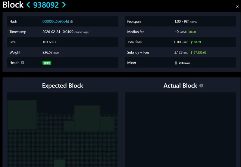根据Mempool.space的区块链数据显示,这名矿工于周二协调世界时早上8:04左右成功验证比特币区块“938092”。