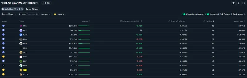 与此同时,数据显示,在周二的交易中,“聪明资金”交易员的持有量排名第11位的是币安发行的锚定比特币代币(BTCB),其后是一些更具投机性的迷因币,如Pump.fun(PUMP)代币和Pepe(PEPE)迷因币。