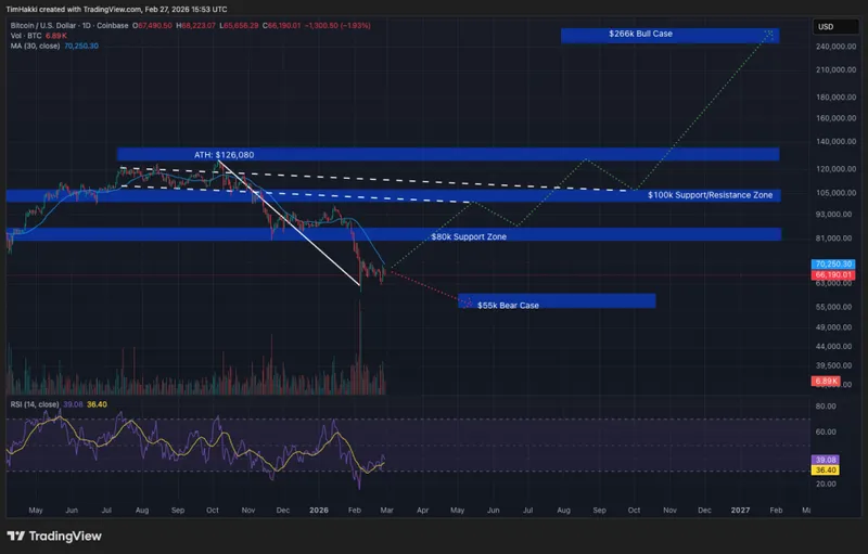 比特币目前占据约1.3万亿美元的2.4万亿美元加密市场。自历史高点以来,BTC已下跌约48%,目前交易价格接近66,000美元,受地缘政治因素影响,经历了两次剧烈抛售。