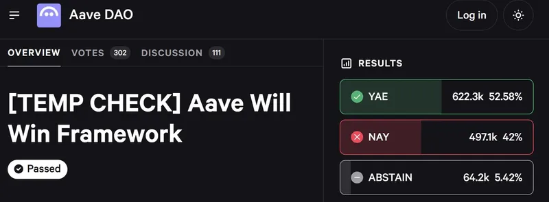 据Aave消息,“Aave Will Win”框架已通过Temp Check投票,成功进入协议治理流程的第一阶段。